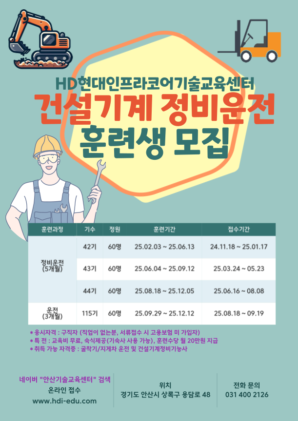 °Ç¼³±â°è ºÐ¾ßÀÇ °ü½É ÀÖÀ¸½Å ºÐ ¸¹Àº Áö¿ø ¹Ù¶ø´Ï´Ù.1. ÈÆ·Ã°úÁ¤¸í : 25 43±â ±¸Á÷ÀÚ °Ç¼³±â°è Á¤ºñ¿îÀü2. ÈÆ·Ã±â°£ : 2025.06.04 ~ 2025.09.12 (5°³¿ù) ¡Ø06.03(È) ÀӽðøÈÞÀÏ·ÎÀÎÇÑ ÈÆ·Ã½ÃÀÛÀÏ º¯°æ¡Ø3. Á¢¼ö±â..