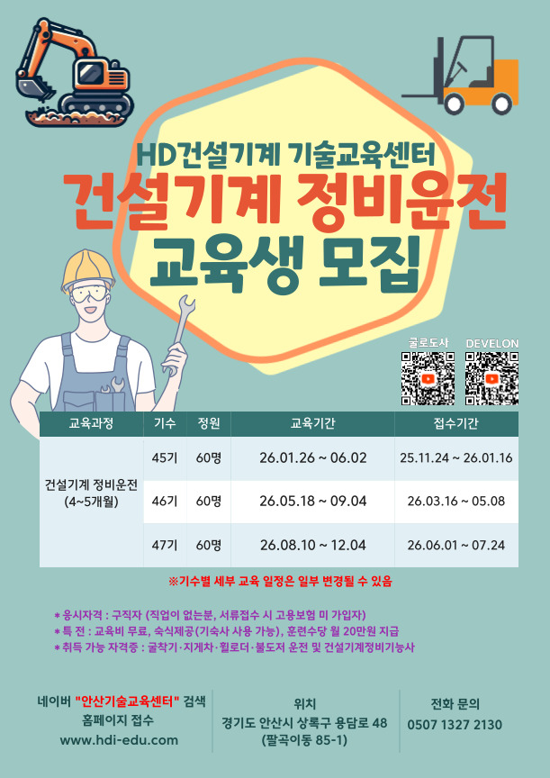 °Ç¼³±â°è ºÐ¾ßÀÇ °ü½É ÀÖÀ¸½Å ºÐ ¸¹Àº Áö¿ø ¹Ù¶ø´Ï´Ù.1. ÈÆ·Ã°úÁ¤¸í : 26 45±â ±¸Á÷ÀÚ °Ç¼³±â°è Á¤ºñ¿îÀü2. ÈÆ·Ã±â°£ : 2026.01.26 ~ 2026.06.02 (5°³¿ù) ¡ØÈÆ·ÃÁ¾·áÀÏ º¯°æ¡Ø3. Á¢¼ö±â°£ : 2025. 11. 24(¿ù) 09:00 ..